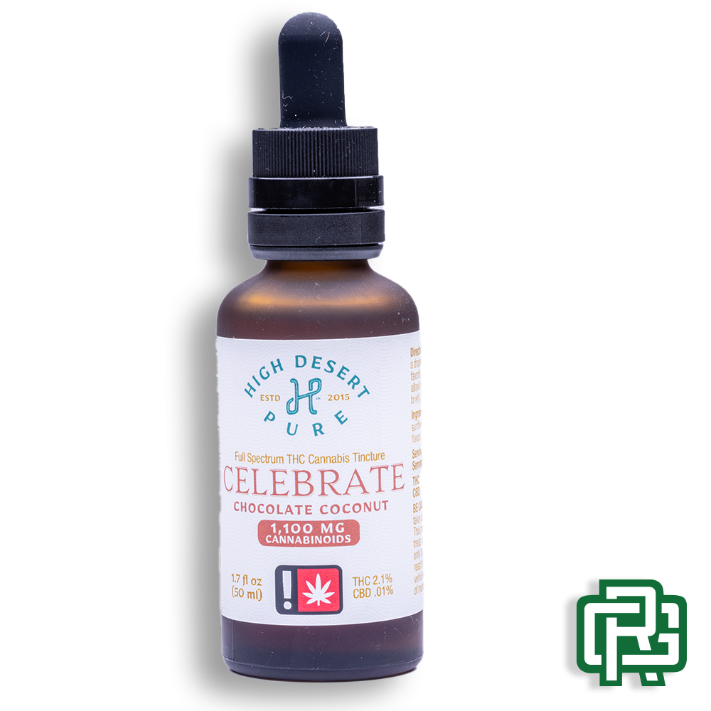 Hybrid | Flavor: Chocolate Coconut | "Celebrate" is a 50mL gentle elixir. 1 dose = 1mL dropper with the whole bottle having 50 servings. | 20mg THC/serving | 1000mg THC/container | Average Activation Time: 40 minutes (can take up to 2 hours) | 1035mg Total Active Cannabinoids (TAC)