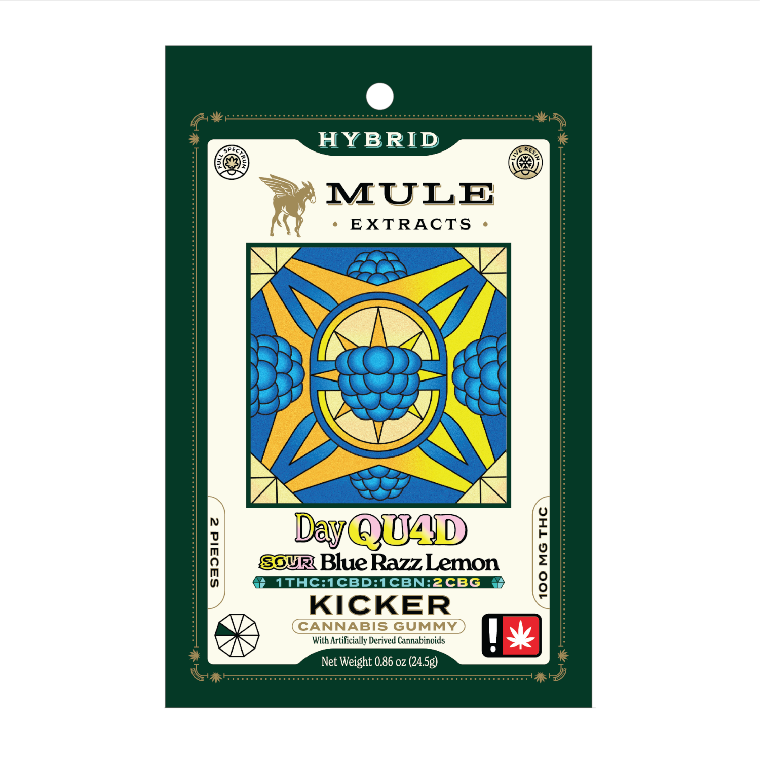 Hybrid | Flavor: Blue Raspberry Lemonade | Strain: LA Kush Cake from BADMOON | Two (2) "Day QU4D Kicker" gummies, each scored into 10 servings (for a total of 20 servings). | 5mg THC, 5mg CBD, 5mg CBN, 10mg CBG per serving | 100mg THC, 100mg CBD, 100mg CBN, 200mg CBG per container