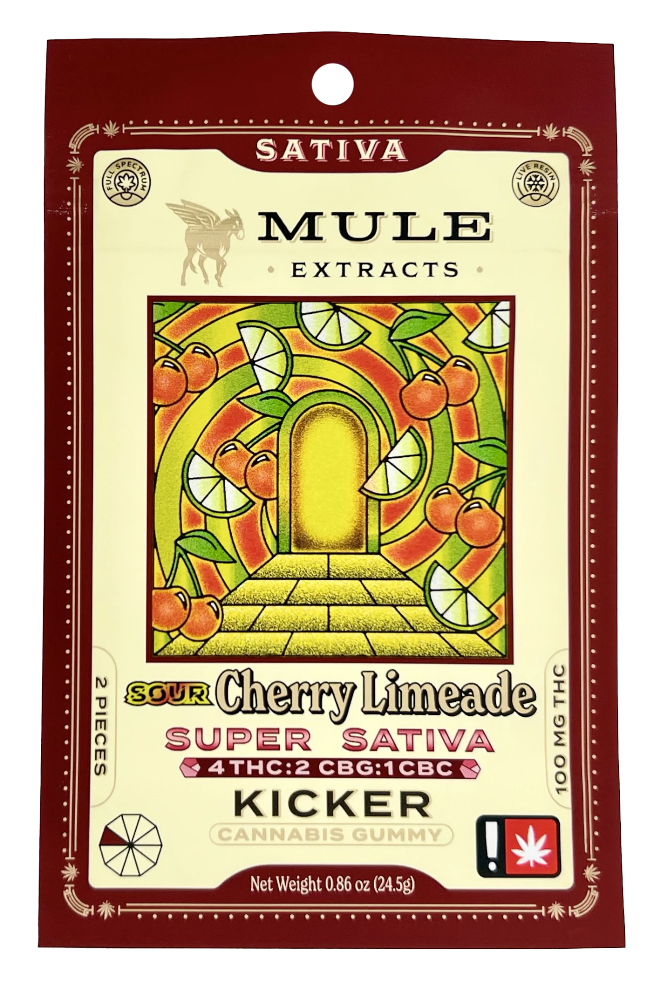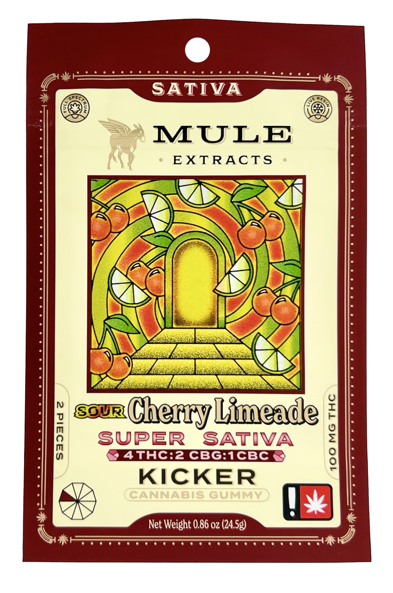 Sativa | Flavor: Cherry Limeade | Strain: Grape Stomper from Blue Land | Two (2) "Super Sativa Kicker" gummies, each scored into 10 servings (for a total of 20 servings). | 5mg THC, 2.5mg CBG, 1.25mg CBC per serving | 100mg THC, 50mg CBG, 25mg CBC per container