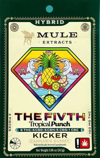 Hybrid | Flavor: Tropical Punch | Strain: Apple Fritter from Wild Flower Farms | Two (2) "The FIVTH Kicker" gummies, each scored into 10 servings (for a total of 20 servings). | 5mg THC, 5mg CBD, 5mg CBN, 5mg CBG, & 1mg CBC per serving | 100mg THC, 100mg CBD, 100mg CBN, 100mg CBG, & 20mg CBC per container